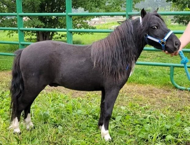 This teeny-tiny 4-year-old miniature horse (with Dwarfism! He is 30” at the shoulder!) miniature horse came to us in August 2021 from StoneRidge Stables & Rehoming Centre with his beautiful friend Katie. Dante knows how to pull a (tiny!) cart. What he lacks in size, he makes up for in boldness… he was not afraid to nose his way into the hay feeder between the draft horses when they first arrived. Our vet Russ nicknamed him “Diablo.”