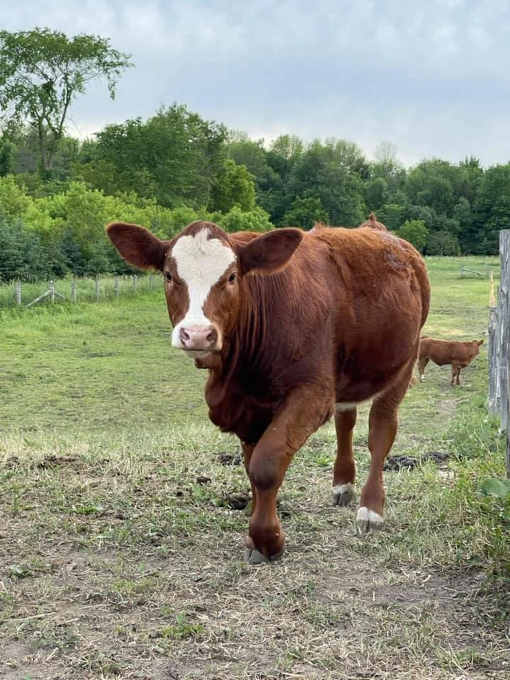 This beautiful Simmental cow was my Christmas gift from my barn helper Joseanne! She was born on November 24, 2020 and arrived at the farm on Christmas Eve 2020 as a one-month-old calf. As the twin to a male calf, she was unlikely to be fertile, and so she ended up here instead of leading an exotic show-cow life.