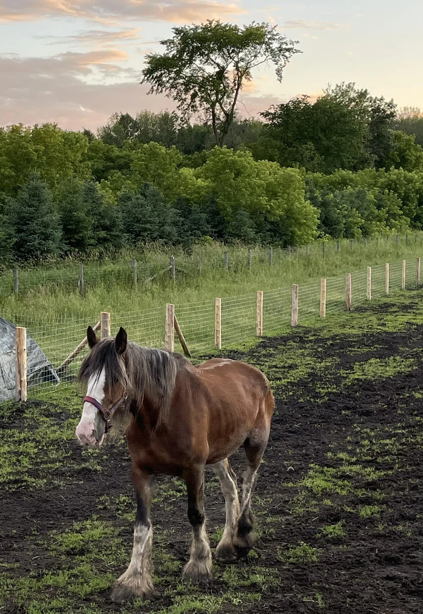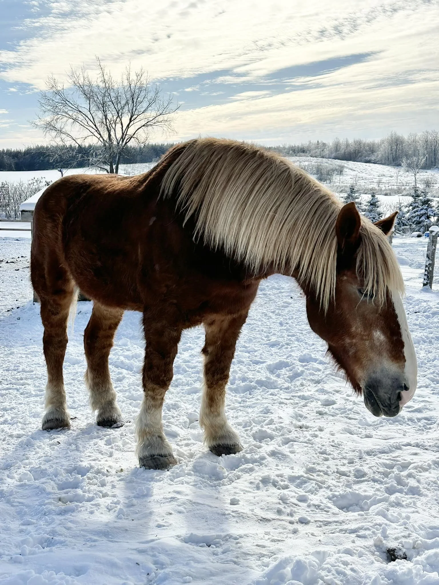 This gentle giant came to us on February 7, 2022 from StoneRidge Stables & Rehoming Centre, along with his Percheron pal, Ella. He’s a 17hh Belgian gelding. They saved Samson from being shipped for meat. After 20+ years hard labour as an Amish work horse, his reward was being sent to the sale barn, virtually a skeleton of a horse. We are doing everything we can to make Samson’s retirement here as happy and healthy as possible!