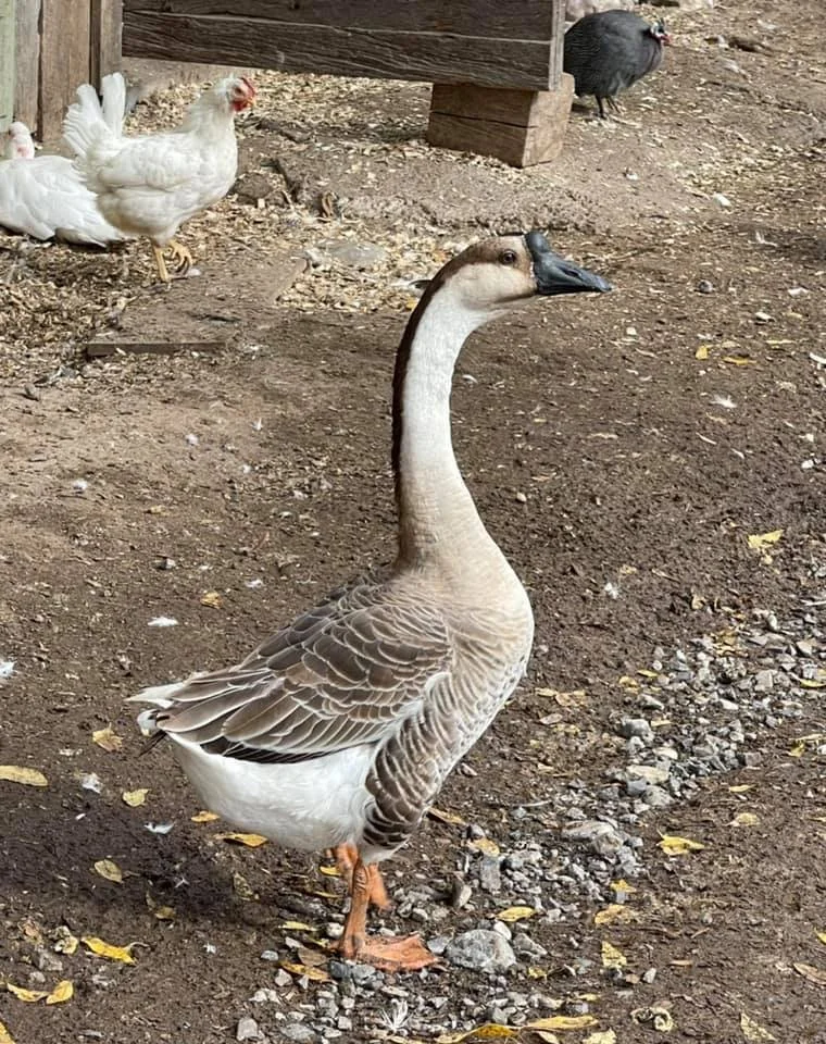This handsome Swan goose came to the farm with his girlfriend Amy in October 2021. They were seen swimming on the Ottawa River, clearly an escape or release from a farm. A caring couple finally managed to catch the goose, and brought them to the farm. Sadly, Amy came down with botulism soon after, and we had her humanely euthanized, but Sheldon lives on, and he now hangs around with his pal James Pond the duck, and bevy of white duck girlfriends! (Sheldon has no qualms about interspecies romance!)
