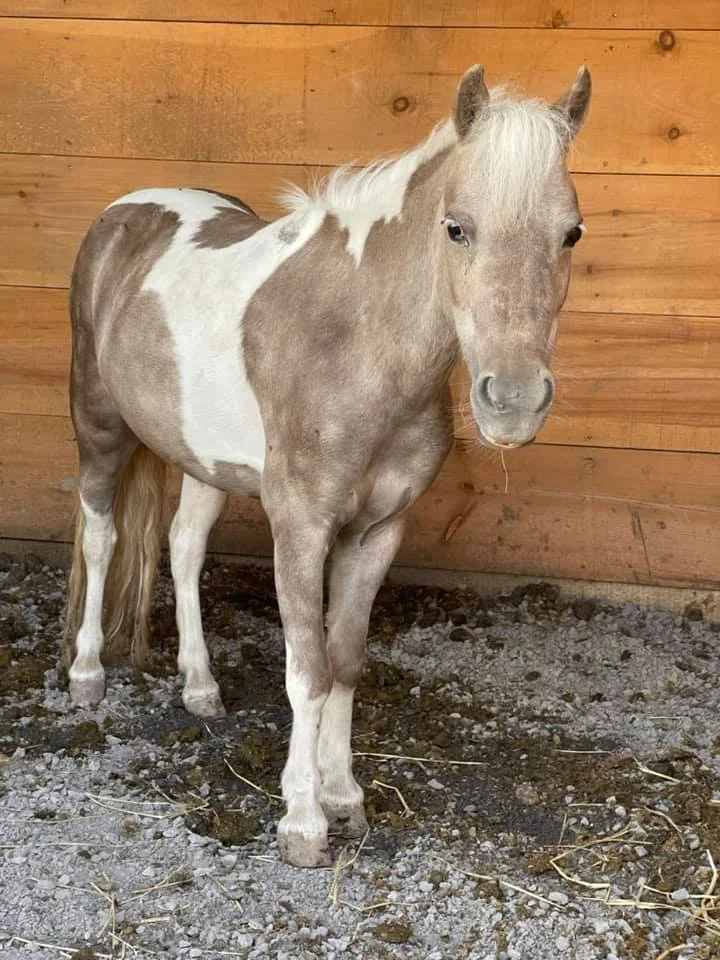 This beautiful grulla paint miniature horse came to us in August 2021 from StoneRidge Stables & Rehoming Centre with her tiny buddy Dante. She’s just a gorgeous little gal who is good with kids and can be ridden or driven, but mostly she enjoys hanging around the hay pile with Dante, and evading capture by Joseanne!