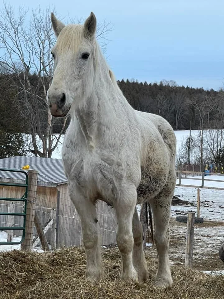 This gorgeous 20-year-old came to us on February 7, 2022 from StoneRidge Stables & Rehoming Centre, along with her Belgian boyfriend, Samson (they bonded in foster care!) She is a very special Percheron, standing at 18hh.