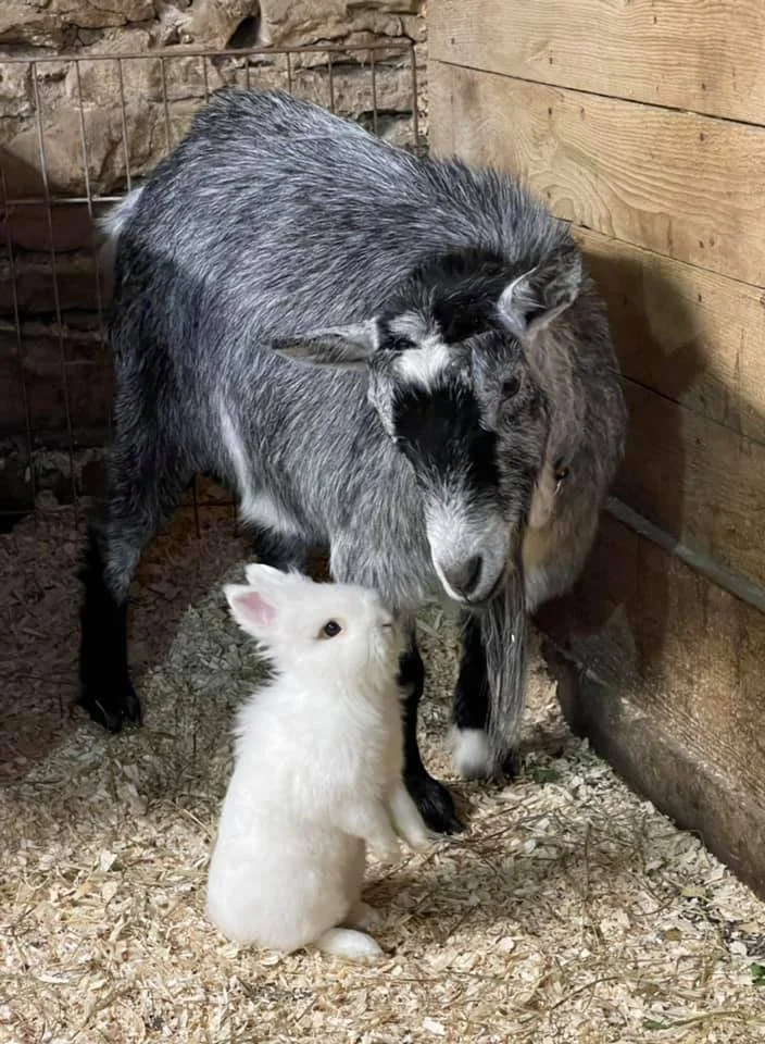 Squiggly does not consider himself to be a goat, and he free-ranges here at the farm during the day, then goes back to his bunny buddy at night. They can often be found cuddled up together. It’s such a unique friendship!